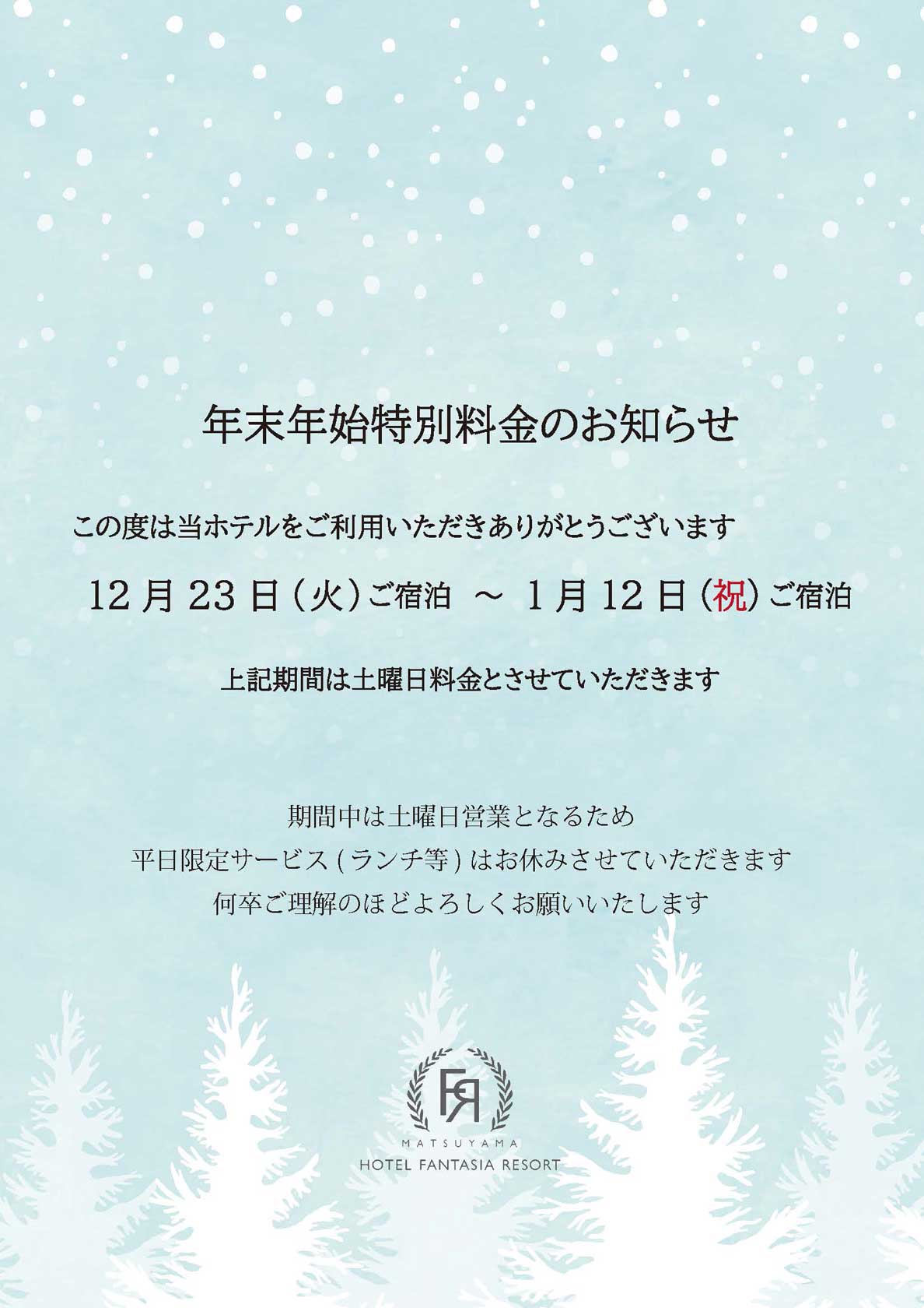 12月23日(火)ご宿泊〜1月12日(祝)ご宿泊は、土曜日料金とさせていただきます。 期間中は土曜日営業となるため、平日限定サービス(ランチ等)お休みさせていただきます。何卒ご理解のほどよろしくお願いいたします。
